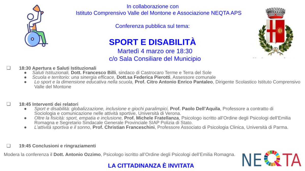 A nome dell’Associazione Italiana per la Neurodiversità, l’Equità e il Talento (NEQTA APS), vogliamo esprimere la nostra più sincera gratitudine per la partecipazione e il contributo di tutti alla conferenza Sport e Disabilità, svoltasi ieri presso la Sala Consiliare del Comune di Castrocaro Terme e Terra del Sole.