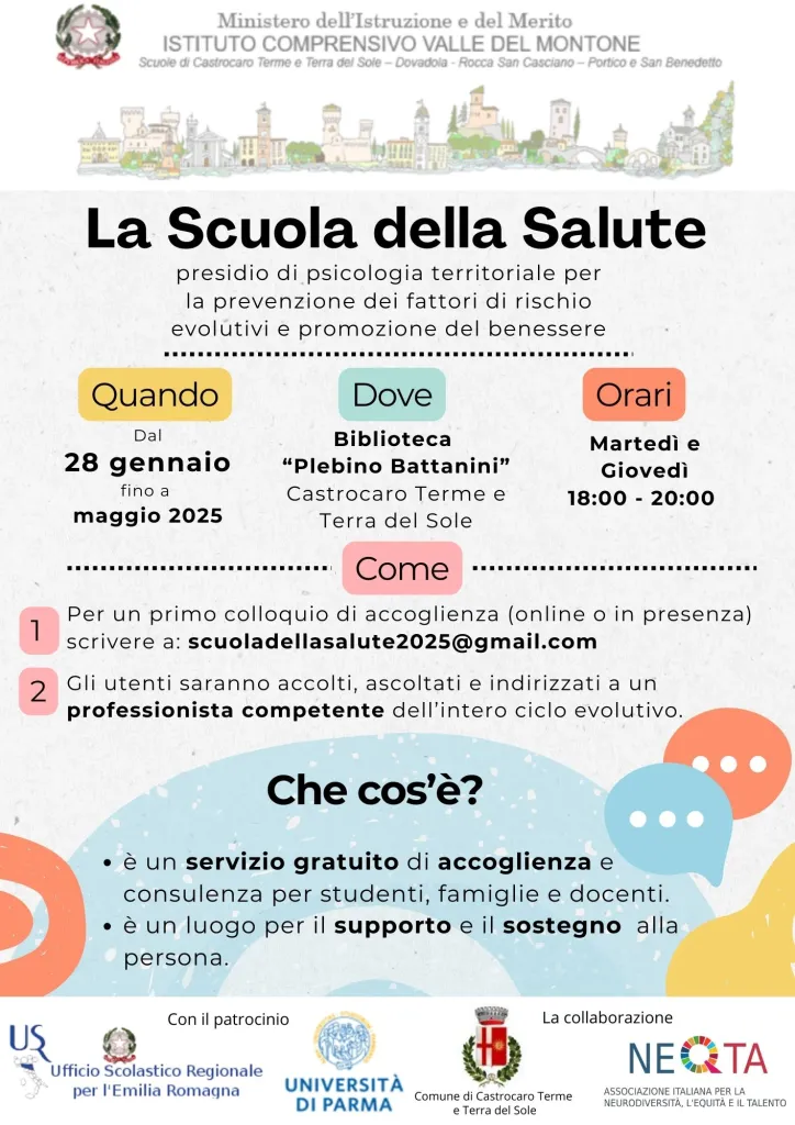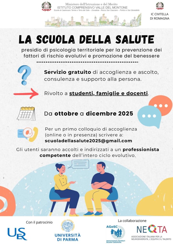 Da ottobre a dicembre 2025, torna il presidio psicologico territoriale “Scuola della Salute”, un 𝐬𝐞𝐫𝐯𝐢𝐳𝐢𝐨 𝐠𝐫𝐚𝐭𝐮𝐢𝐭𝐨 𝐝𝐢 𝐚𝐬𝐜𝐨𝐥𝐭𝐨, 𝐚𝐜𝐜𝐨𝐠𝐥𝐢𝐞𝐧𝐳𝐚 𝐞 𝐜𝐨𝐧𝐬𝐮𝐥𝐞𝐧𝐳𝐚 𝐫𝐢𝐯𝐨𝐥𝐭𝐨 𝐚 𝐬𝐭𝐮𝐝𝐞𝐧𝐭𝐢, 𝐟𝐚𝐦𝐢𝐠𝐥𝐢𝐞 𝐞 𝐝𝐨𝐜𝐞𝐧𝐭𝐢.