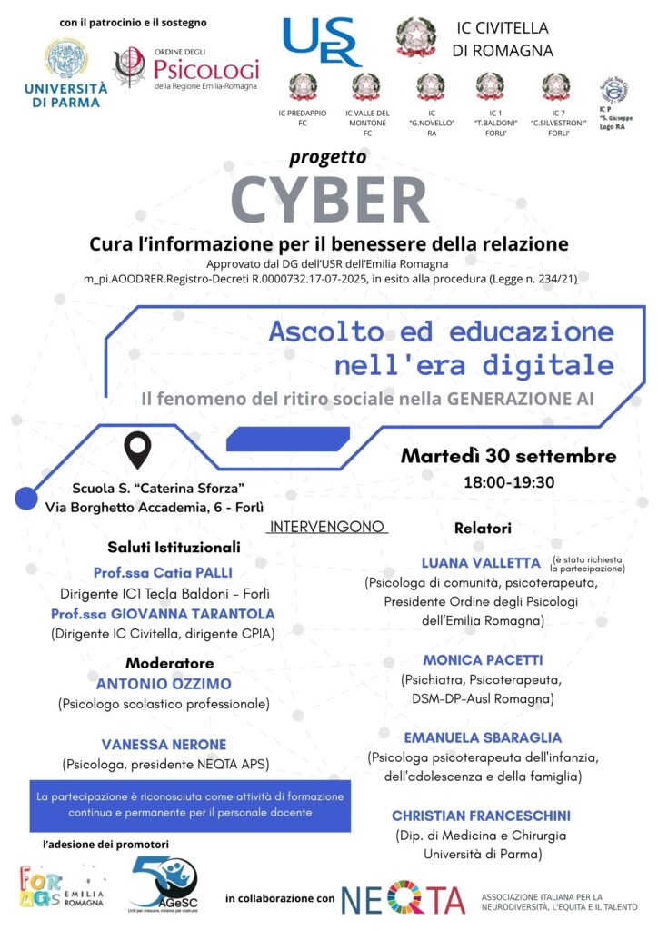 Il 30 settembre, con la conferenza “𝐀𝐬𝐜𝐨𝐥𝐭𝐨 𝐞𝐝 𝐞𝐝𝐮𝐜𝐚𝐳𝐢𝐨𝐧𝐞 𝐧𝐞𝐥𝐥’𝐞𝐫𝐚 𝐝𝐢𝐠𝐢𝐭𝐚𝐥𝐞 – 𝐈𝐥 𝐟𝐞𝐧𝐨𝐦𝐞𝐧𝐨 𝐝𝐞𝐥 𝐫𝐢𝐭𝐢𝐫𝐨 𝐬𝐨𝐜𝐢𝐚𝐥𝐞 𝐧𝐞𝐥𝐥𝐚 𝐆𝐞𝐧𝐞𝐫𝐚𝐳𝐢𝐨𝐧𝐞 𝐀𝐈”, (patrocinata dall’𝑶𝒓𝒅𝒊𝒏𝒆 𝒅𝒆𝒈𝒍𝒊 𝑷𝒔𝒊𝒄𝒐𝒍𝒐𝒈𝒊 𝒅𝒆𝒍𝒍’𝑬𝒎𝒊𝒍𝒊𝒂-𝑹𝒐𝒎𝒂𝒈𝒏𝒂) ha preso ufficialmente avvio il nuovo anno di attività del Progetto Cyber – Cura dell’informazione per il benessere della relazione, approvato dal DG dell’USR dell’Emilia Romagna.
